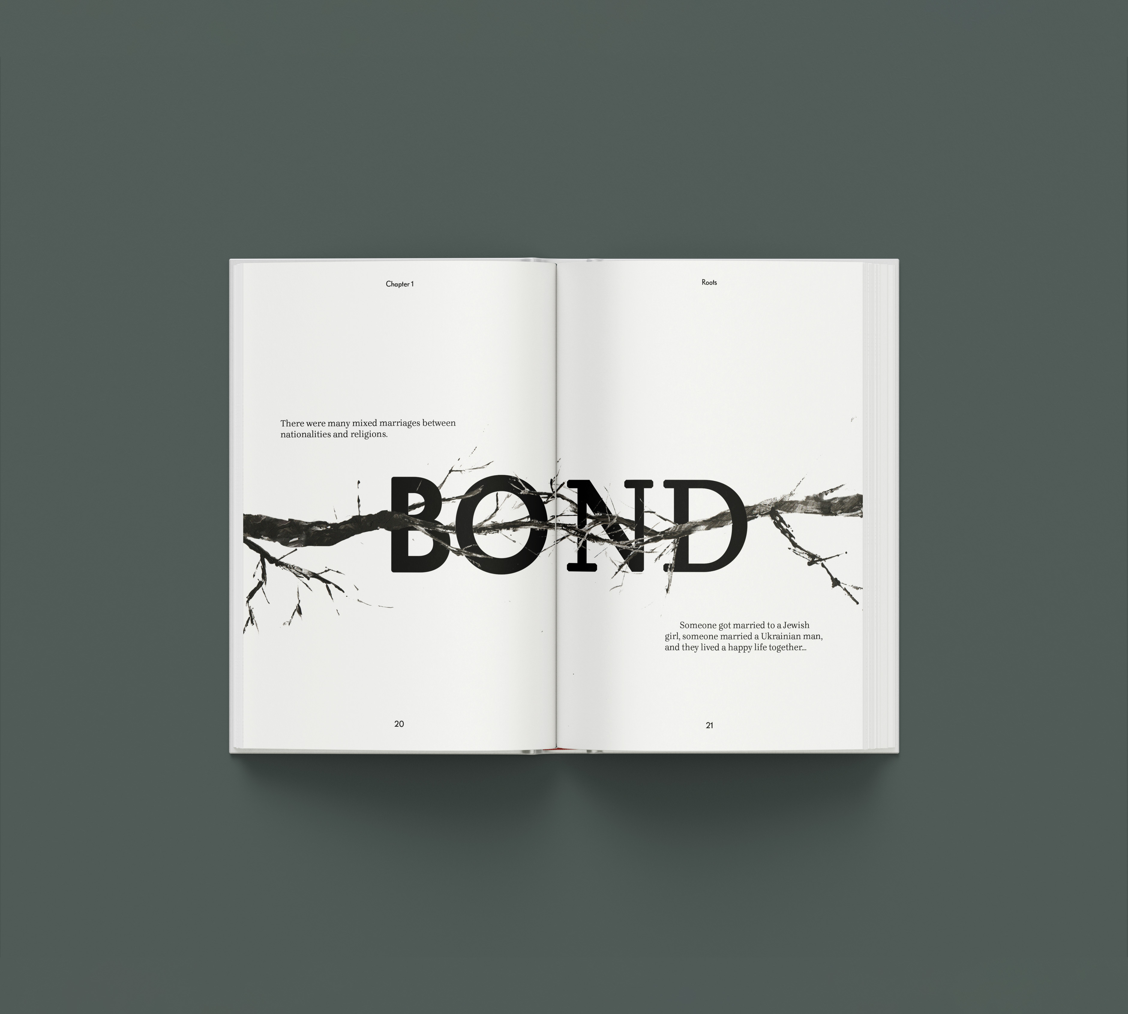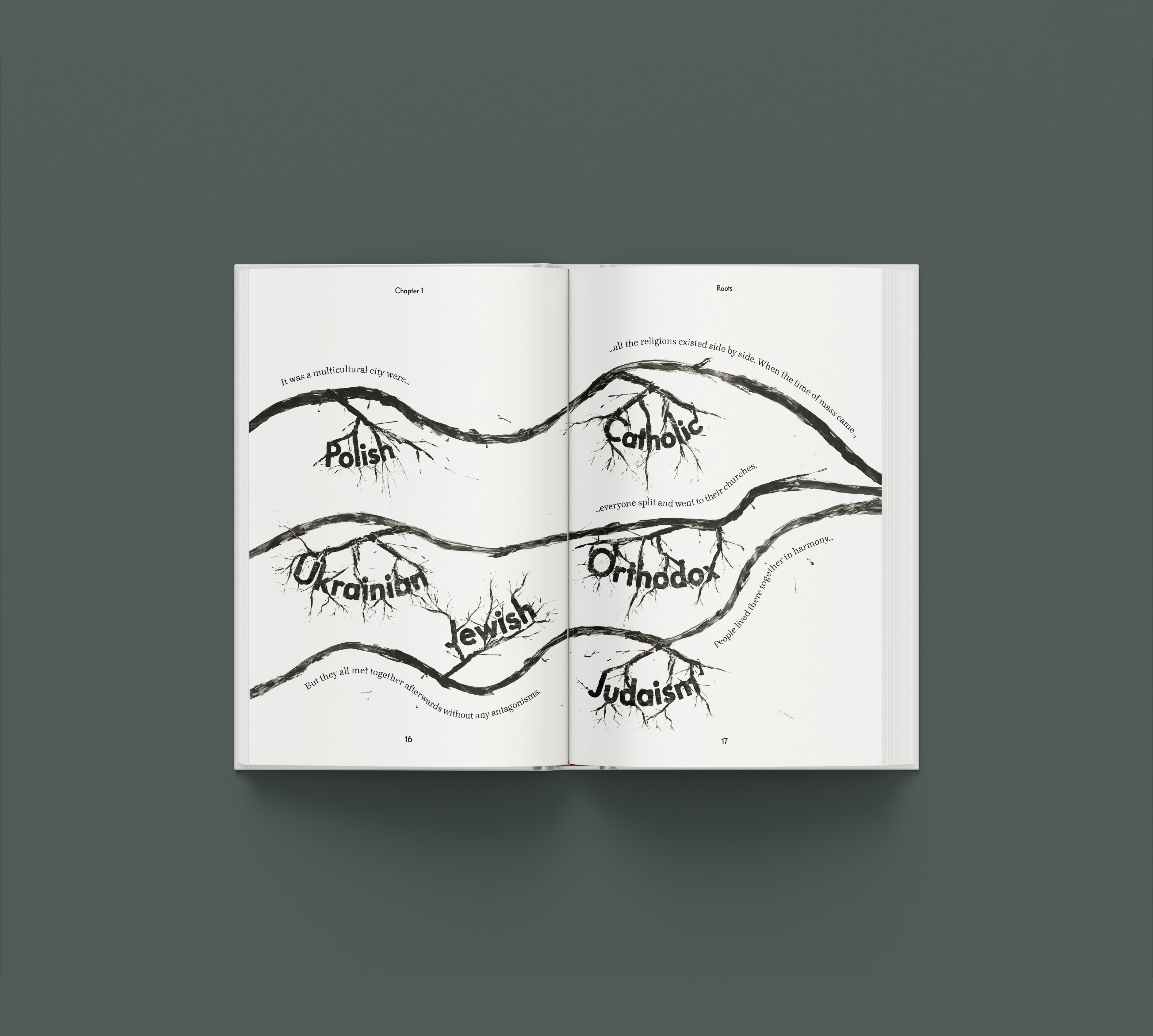 Based on an interview with my great aunt, who lived through these events, the project uses real roots to create gritty, organic textures, while Polish typefaces express cultural identity. A custom typeface drawn from my grandfather’s handwriting adds a personal layer, contrasted by a Blackletter-style typeface representing Germany and a Constructivist one symbolising Russia.